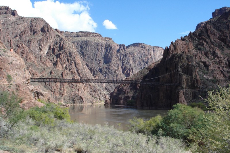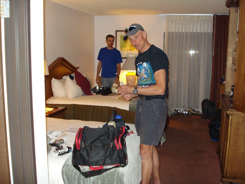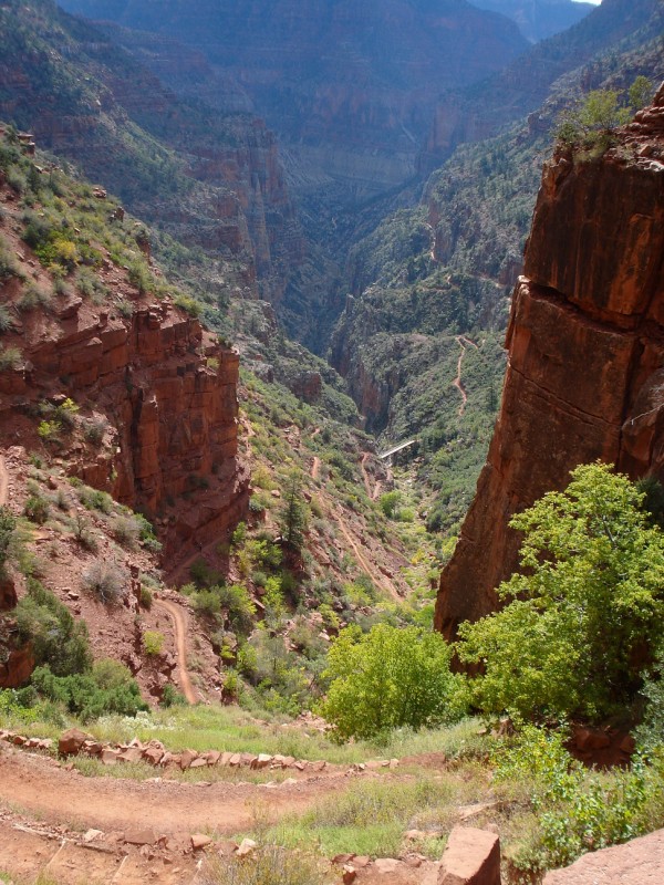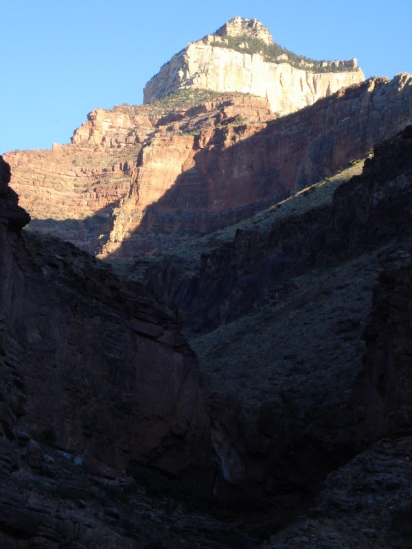 We awoke at 4:15am gathered our last bits of gear, shoved some food into our mouths, and left Tusayan for the South Kaibab trailhead. We started with a short jog down the road reaching the trailhead 5min later, passing by several groups prepping for an early morning hike to Phantom Ranch. At 5:10am we dropped off the south rim and down into the darkness below. I started at a quick pace, cruising down, down, down, the switchbacks. Within 15min the temperature had gone from high 30s to nearly 60, so I stripped off my wind breaker, gloves, and arm sleeves. 5:40am found me at Skull Point, where I stashed my 1L of water for the hike out and my jacket. As I dropped below Skull Point the flashlights above me bobbing down the trail disappeared, and I was alone. The early morning was calm and quiet with the only things visible being my flashlight beam and the silhouette of the canyon walls far above. 6:00am Found me at "The Tipoff" as the early morning light began to show the immenseness of my surroundings. Soon after, my light went off and I was jogging along into the heart of the canyon. I crossed the black bridge over the Colorado River and reached Phantom Ranch at 6:30am (7.5miles).
