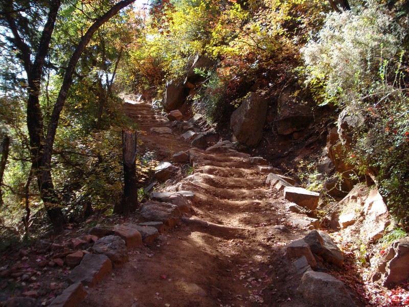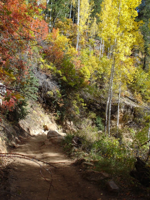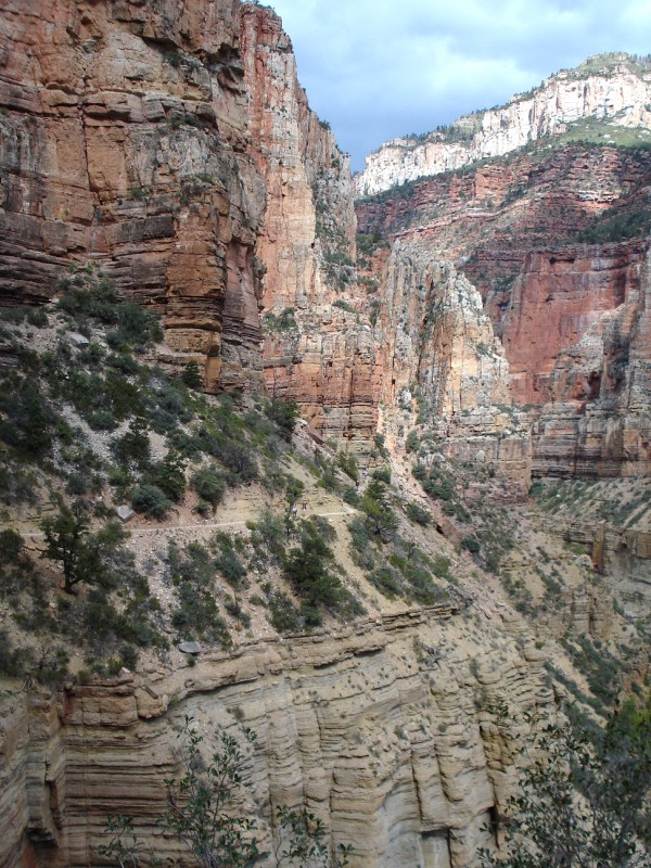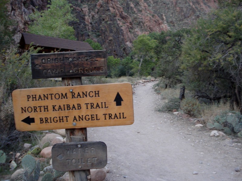 9:25am I quickly filled water again and munched on a snack, looking to quickly leave the masses behind. This is where the true uphill begins, so I settled into a quick hike. The roaring of the river and Roaring Springs and the sheer magnitude of the canyon were a welcome distraction from the constant flow of people who were streaming down the trail. I continued my hike with a few short jogs along the flatter sections of the shelf trail. The trail here is cut into the sheer rock walls with a several hundred foot drop to the river below. Here the rock changes from the tan Navajo sandstone to the red Supai sandstone. Up, up, up, finally I reached the last set of steep switchbacks that leads to the Supai Tunnel. By the time I'd reached the tunnel (18.9mi) the sun was shining in full force and the temperature was rising. I once again filled my water, dunked my head, and continued up the final steep climb to the North Rim. Above the tunnel beings the alpine zone; oaks, maples, and pines cover much of the trail. The upper trail was dotted with golden aspens and brilliant red maples that added a colorful hue to the trail. Just under 5h after starting I reached the North Rim North Kaibab trailhead (10:05am 20.9mi). I sat down briefly to enjoy a snack and the silence of an empty trailhead almost 6000ft above the canyon bottom. As the flies began to swarm I packed up for the long trip down to Phantom Ranch. I was feeling really strong in the cool air of the North Rim, so I hammered downhill. I soon passed Jeff and Jonathan, both feeling good and moving quickly toward the North Rim. I flew past the Supai Tunnel, quickly cooling down again, and off down the steep switchbacks toward the inner canyon. As I neared the bottom of the Supai switchbacks I loked up and was surprised to see Ryan Burch hiking up towards me. We stopped for a brief chat, him and three others from Gunnison were also out for a R2R2R run. I bid him and his friend Doug farewell and headed back down the trail into the warmth of the canyon. As the temperature crept up, thunderclouds began to build, a welcome sight, that brought hope for cooler than expected high temperatures (92F). When I returned to the Caretaker's Cabin this time there were only two other people milling around. The temperatures were nearing 80F, so I drenched my head and continued down to Cottonwood Campground. I ran well down to the CG, though I was teetering on the edge of dehydration (1130am, 27.1mi). Upon reaching the Cottonwood CG I refilled my water, chugged a bunch and once again soaked myself in an effort to stay ahead of the heat.