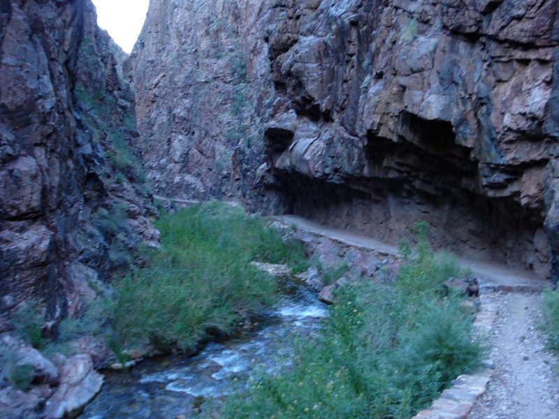 As I left Cottonwood I was starting to feel a little off for the first time all day. My abs were cramping so I took more electrolytes and walked the flat terrain for a bit. I was soon running again straight into "The Box". This is where it all fell apart for me last time, so I was very vigilant on my physical status. As I entered the upper portion of this narrow canyon the cramps came back and the gel shot I took made me nauseous. So I walked the normally fast section of trail along the gurgling Bright Angel creek. Finally the 10oz of water, salt cap and gel settled and I was able to run the last few miles into Phantom Ranch (1250p, 34.3mi). Last time the radiative heat of the canyon walls sent the air temperatures sky rocketing to 113F. This fall the cooler temps and the late morning clouds, which were now gone, kept temps in the mid 80s, very pleasant.