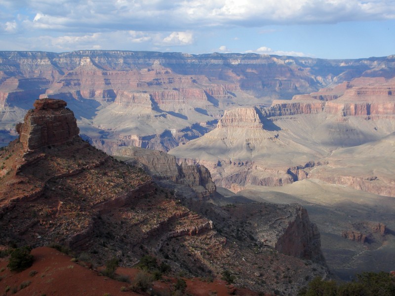 1:00pm After bumming a cup of ice off the nice people at Phantom Ranch, drinking 1/2L of water, I took off jogging to the black bridge and the long ascent up the South Kaibab trail. As I crossed the black bridge and looked up, the daunting task of climbing all the way to the South Rim, 6miles of steep uphill, lay ahead. The afternoon was warm, but there was a pleasant breeze that made the trudge much nicer. The muscles were fatiguing, but I was still maintaining a decent pace through "The Tipoff". As I began the steep switchbacks to Skull Point the earlier dehydration and general fatigue were slowing me down, but I kept on trudging. At Skull Point I retrieved my stashed water and wind breaker, still cool from its hiding spot. As I ascended past Skull Point my focus became putting one foot in front of the other and doing my best to push through the fatigue. Soon after I stopped for a rest break, as I looked back into the canyon the sheer size of everything hit me. I watched the ants (people) make there way up the trail with the massive rock monuments tower overhead. As the shadows slowly drifted across the ridges and temples of the canyon I realized that inspite of the recent fatigue it had been a spectacular run. I hadn't worried about any of the troubles of the past months, all the stress of the "real world" had not even crossed my mind. My legs didn't feel any better, but when I stood back up, mentally I was alert and completely at ease. For the first time on the climb I was able to simply enjoy the trail and the massive cathedral in which I'd spent the day. All the events of the past several years, good and bad, had enabled this journey to occur. As I approached the South Kaibab TH I felt great. Yes my legs were tired, yes I hadn't reached my ultimate goal of 10 hours, but I had pushed myself, and had taken the time to soak in the vastness, and beauty of the canyon and all it had to offer. I couldn't think of another way I would have liked to spend the weekend. After arriving at the South Kaibab TH (2:53p, 41.8mi) I was unexpectedly greeted by Megan Burch and Amy Callahan, both of whom were out hiking and supporting their husbands on their R2R2R quest. It was nice to be able to decompress in the company of friends. A little stretching and lots of food and water capped off a beautiful day at the big ditch.